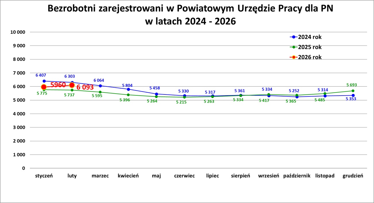 Na dzień 28.02.2026 r. liczba zarejestrowanych bezrobotnych wynosiła 6 093 osoby. W lutym 2026 r. wystąpił wzrost liczby osób bezrobotnych   w stosunku do stycznia...